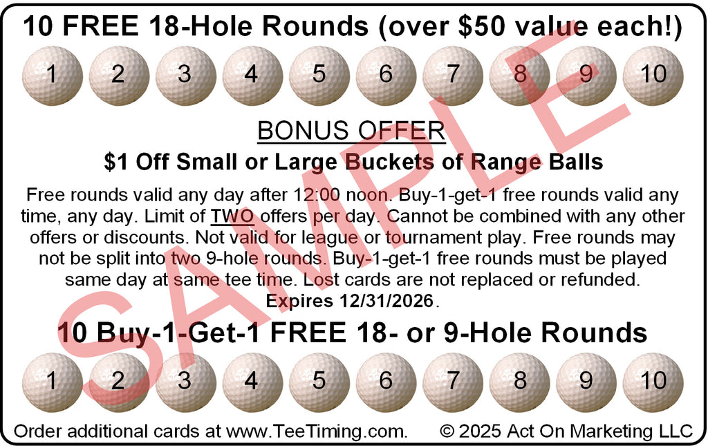 *Free rounds valid any day after 12:00 noon. Buy-1-get-1 free rounds valid any time, any day. Limit of TWO offers per day. Cannot be combined with any other offers or discounts. Not valid for league or tournament play. Free rounds may not be split into two 9-hole rounds. Buy-1-get-1 free rounds must be played same day at same tee time. Lost cards are not replaced or refunded. Expires 12/31/2026.*